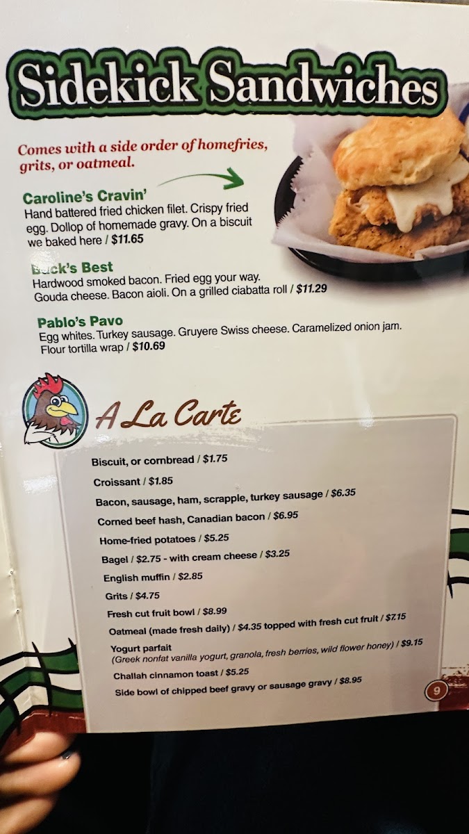 Hand-battered fried chicken filet, crispy fried egg, dollop of homemade gravy. On a biscuit, we baked here.